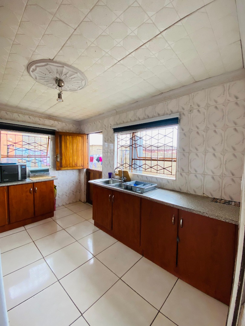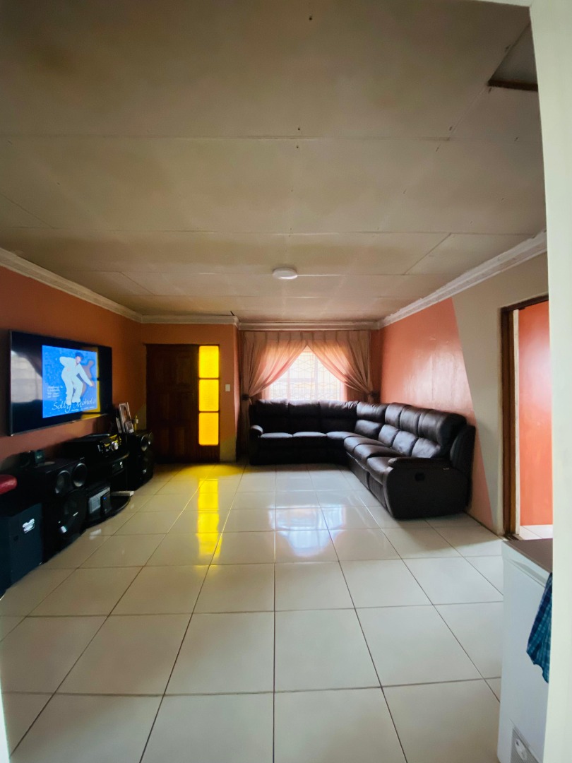 As you step inside, you’re greeted by a spacious lounge area, perfect for relaxing with family or entertaining guests. The space is neatly tiled throughout, giving the home a clean and modern feel while making it easy to maintain. The kitchen is fully fitted and comes equipped with built-in cupboards and a stove, offering convenience and practicality for everyday cooking. The layout allows for easy movement and creates a warm, inviting atmosphere for family living.