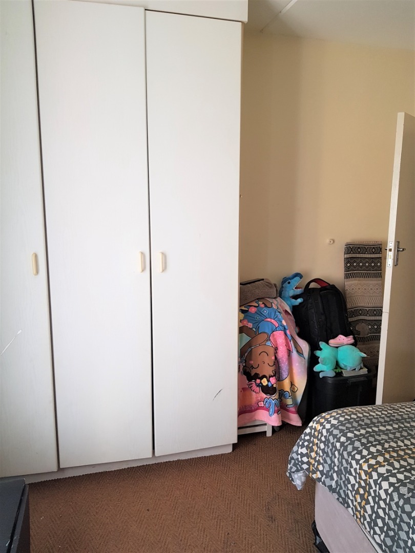 The apartment features two well-sized bedrooms, both fitted with built-in cupboards and windows that allow for natural light and ventilation. The main bedroom comfortably accommodates a double or queen-sized bed, while the second bedroom is ideal for a single or double bed, making it perfect for a child's room, guest room, or home office.