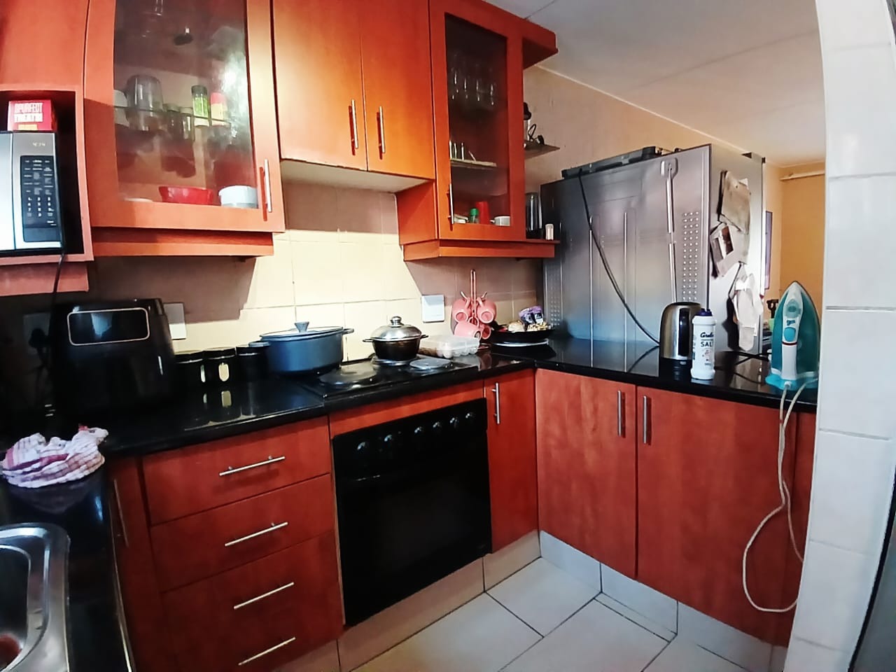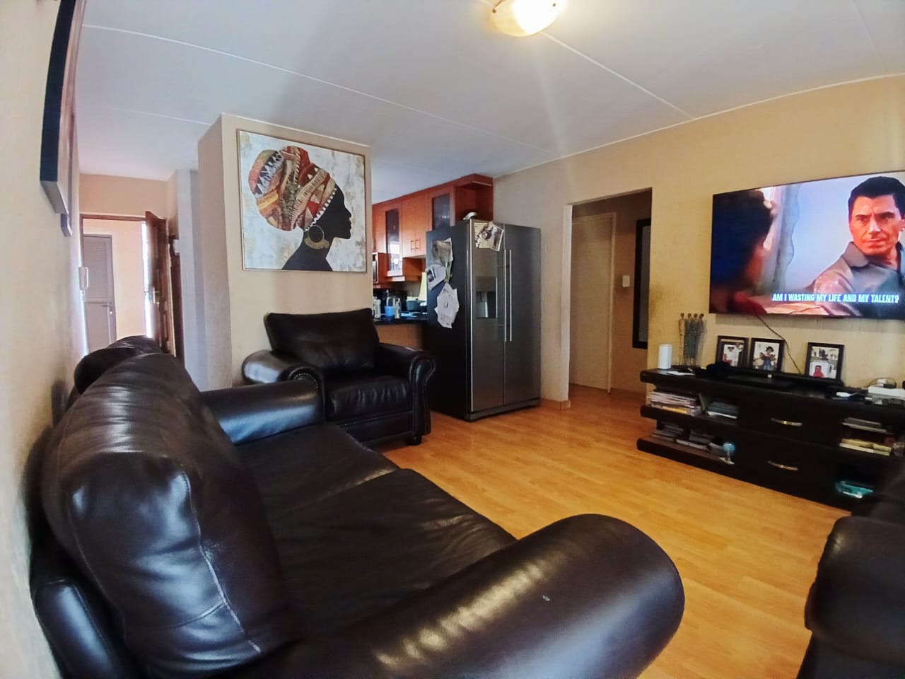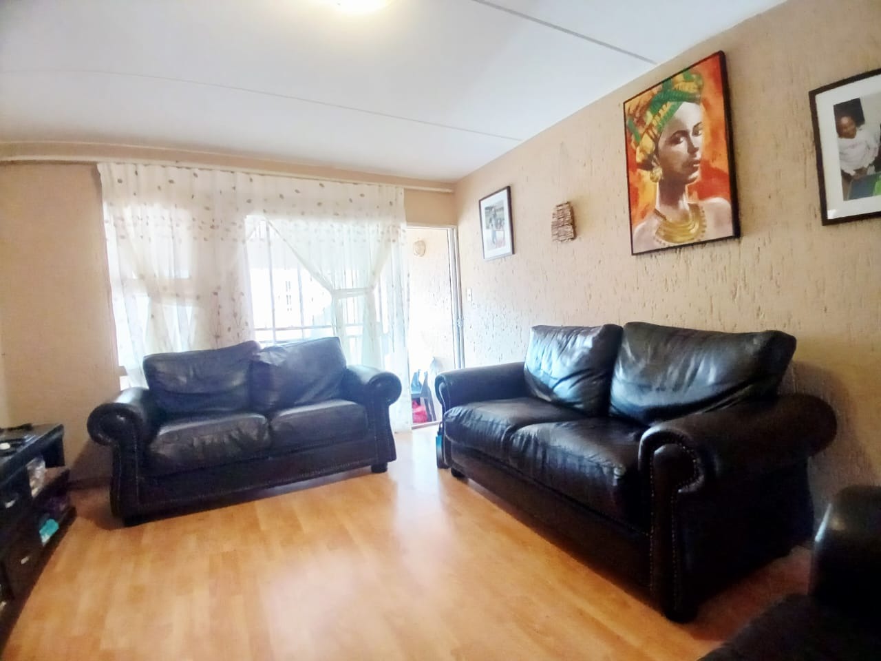 Discover comfortable suburban living in this inviting 2-bedroom, 1-bathroom unit located within a well-established complex in Mondeor, Johannesburg. Spanning a practical 62 square metres, this residence offers a functional layout designed for ease and convenience, ideal for individuals or small families seeking a secure and accessible home. Upon entering, you are greeted by an open-plan living area that seamlessly integrates with the kitchen, creating a cohesive and spacious feel. The living room features durable wood-look laminate flooring, which extends throughout the main areas, providing a clean and contemporary aesthetic that is also easy to maintain. Ample natural light streams in through large windows, illuminating the space and highlighting the comfortable dark leather-style seating and personalized artwork that adorn the textured walls, adding character and warmth to the home. A large wall-mounted TV serves as a focal point for entertainment. The kitchen, a central hub of the home, is equipped with dark wood cabinetry offering generous storage, complemented by dark countertops. It includes a built-in oven and hob, a double sink, and a modern stainless steel refrigerator, catering to all your culinary needs. The tiled flooring and backsplash ensure practicality and easy cleaning, while a window above the sink provides natural light and ventilation. This unit comprises two well-proportioned bedrooms, each featuring laminate wood flooring and built-in storage, ensuring a tidy and organized living environment. Natural light enhances the comfort of these private spaces. The single bathroom is conveniently located to serve both bedrooms, completing the functional interior layout of this home. Residents of this complex benefit from a range of communal amenities, including a swimming pool, perfect for relaxation and recreation during warmer months. The property offers one dedicated parking bay, with additional covered parking bays visible within the complex, enhancing convenience. The multi-story building design, with its neutral exterior and individual access points, contributes to a pleasant living environment. Security is a priority, with the complex featuring an access gate and being totally walled, providing peace of mind for residents. Mondeor is a well-regarded suburban area in Johannesburg, known for its family-friendly atmosphere and convenient access to local amenities, schools, and major transport routes. This location offers a balanced lifestyle, combining the tranquility of suburban living with the accessibility of urban conveniences. Key Features: * 2 Bedrooms, 1 Bathroom * 62 sqm Floor Size * Open-plan living and kitchen area * Wood-look laminate flooring * Functional kitchen with built-in oven/hob * Access to communal swimming pool * One dedicated parking bay * Secure complex with access gate and total walling * Suburban location in Mondeor, Johannesburg