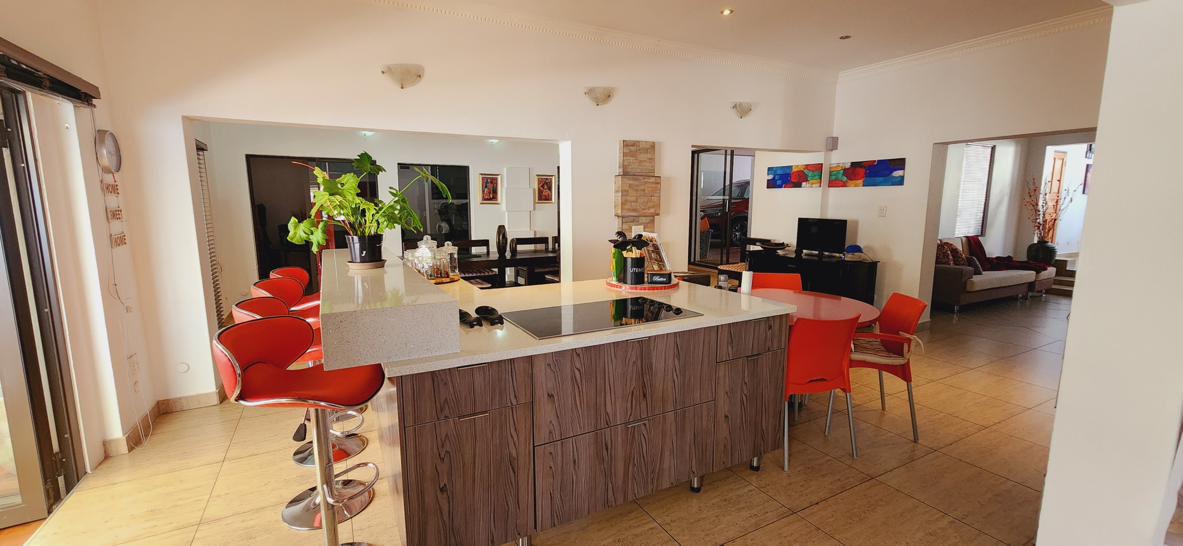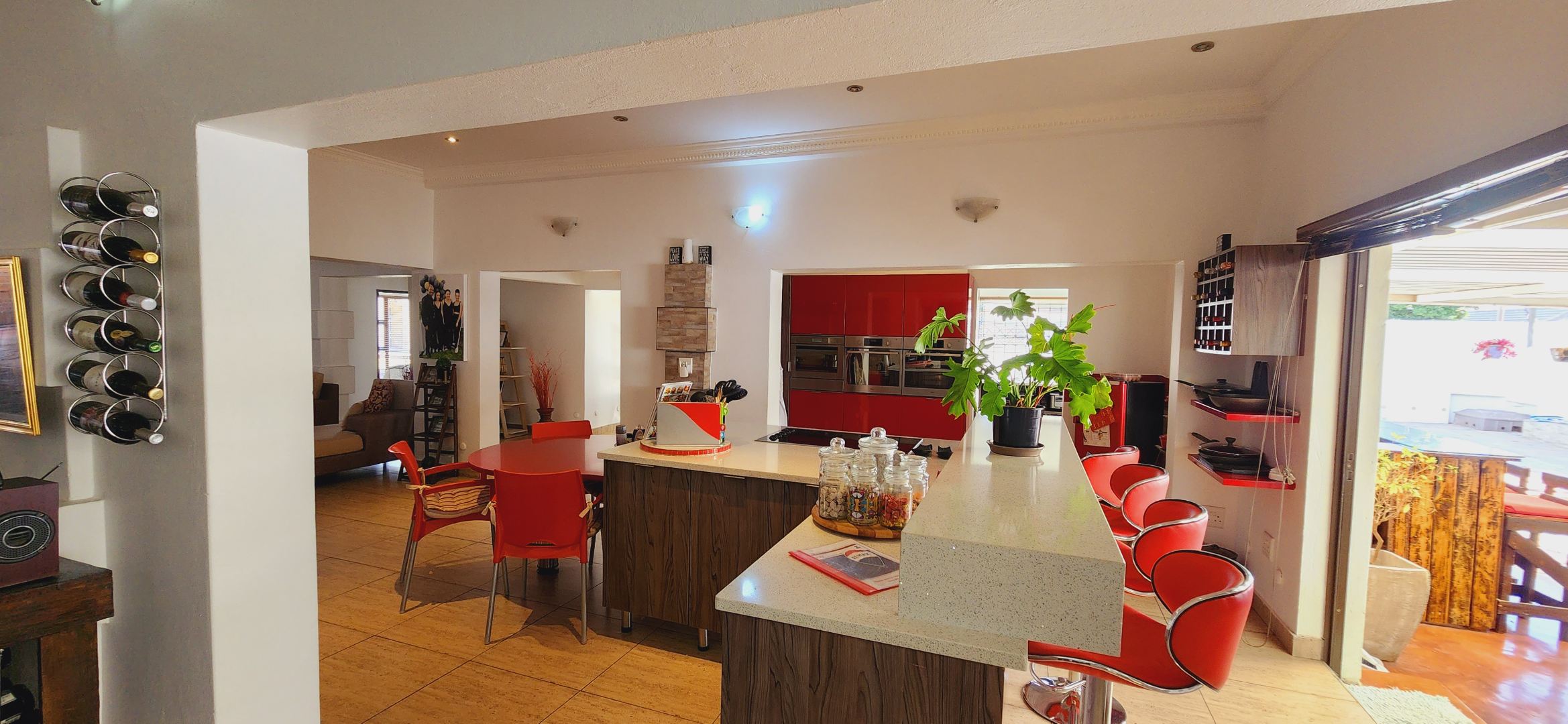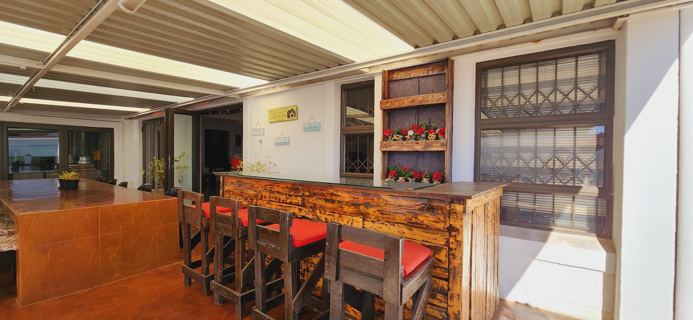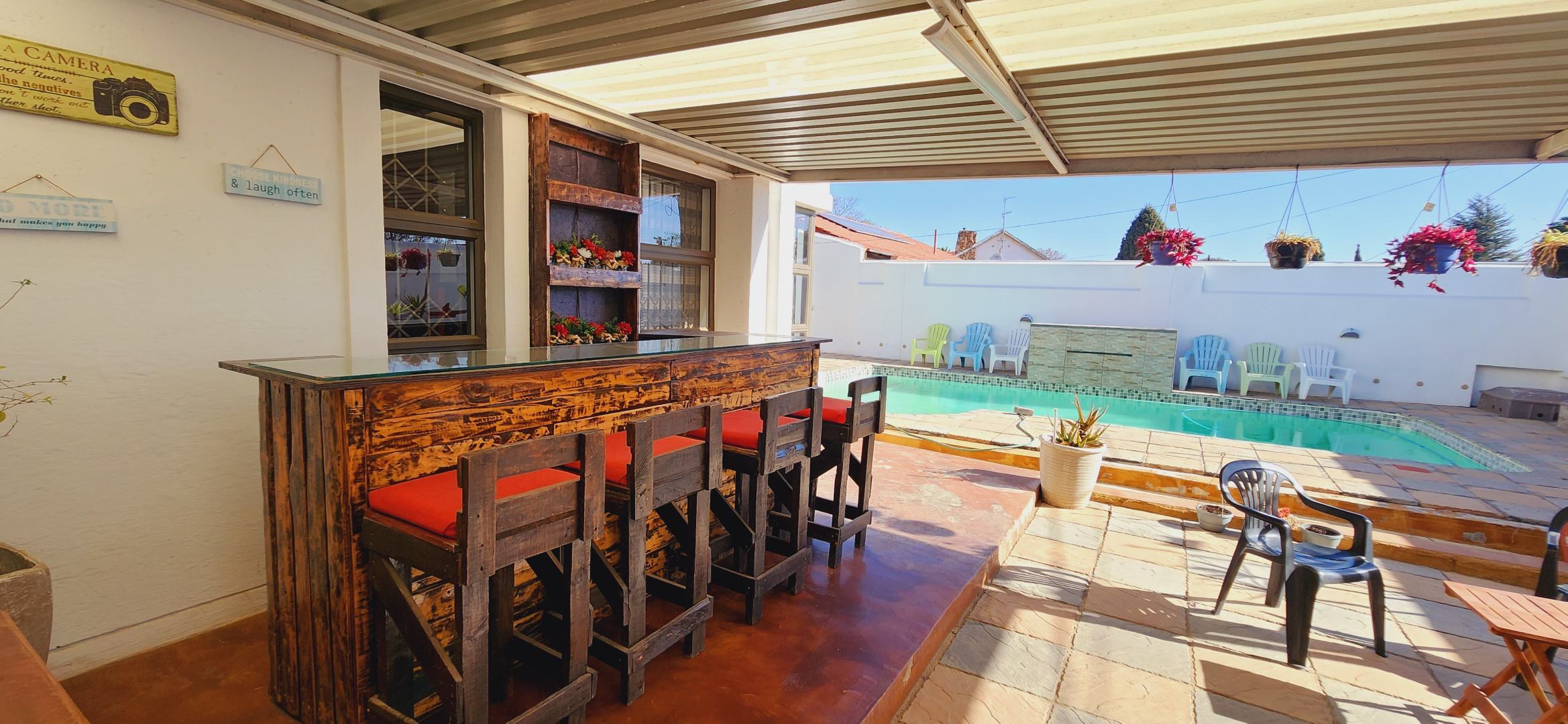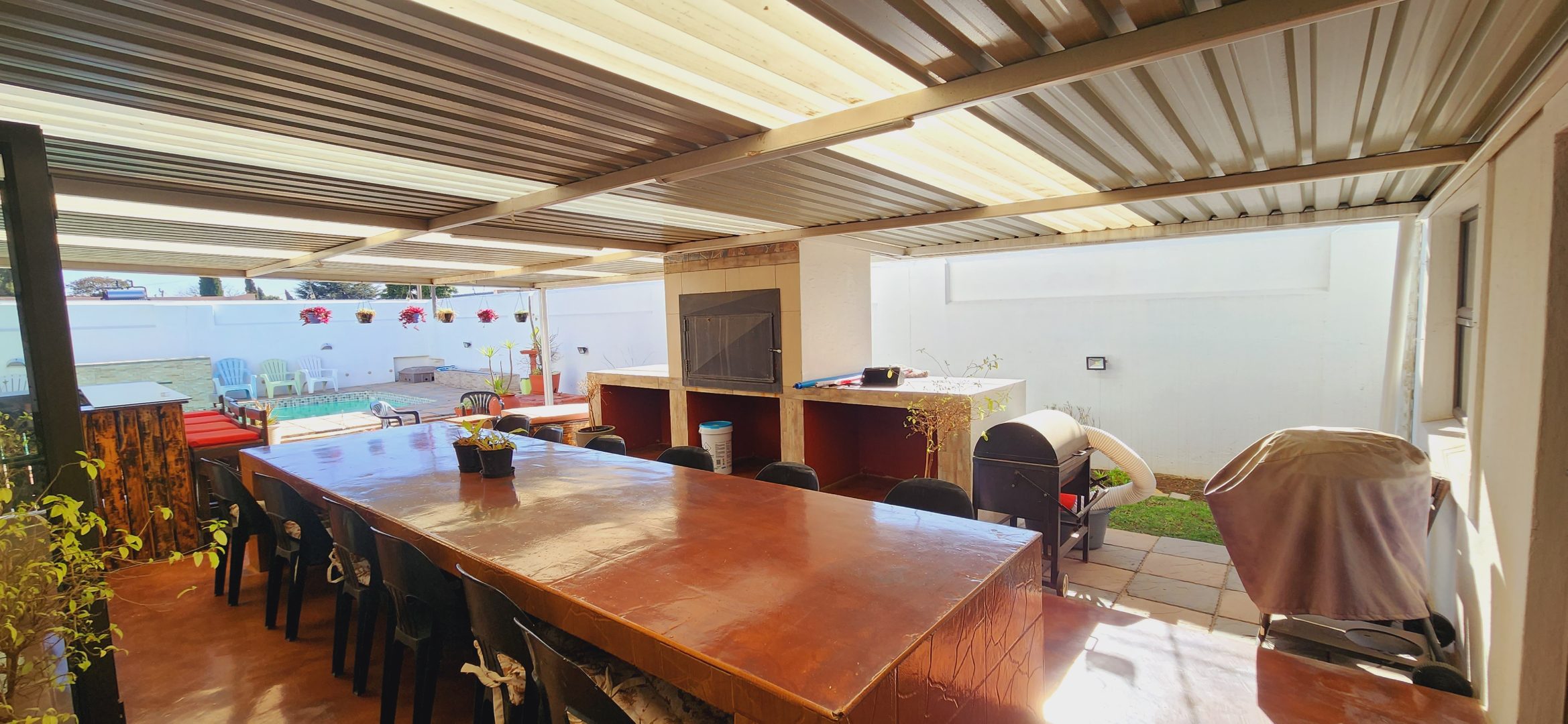 The outdoor area is just as impressive as the inside. The backyard features a sparkling swimming pool, a braai area, a bar area, and multiple entertainment and dining spaces – all surrounded by a well-kept garden. This setup is perfect for hosting gatherings or enjoying leisurely weekends with family and friends.