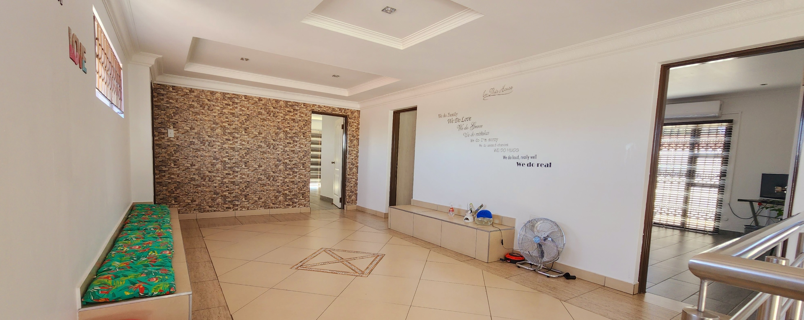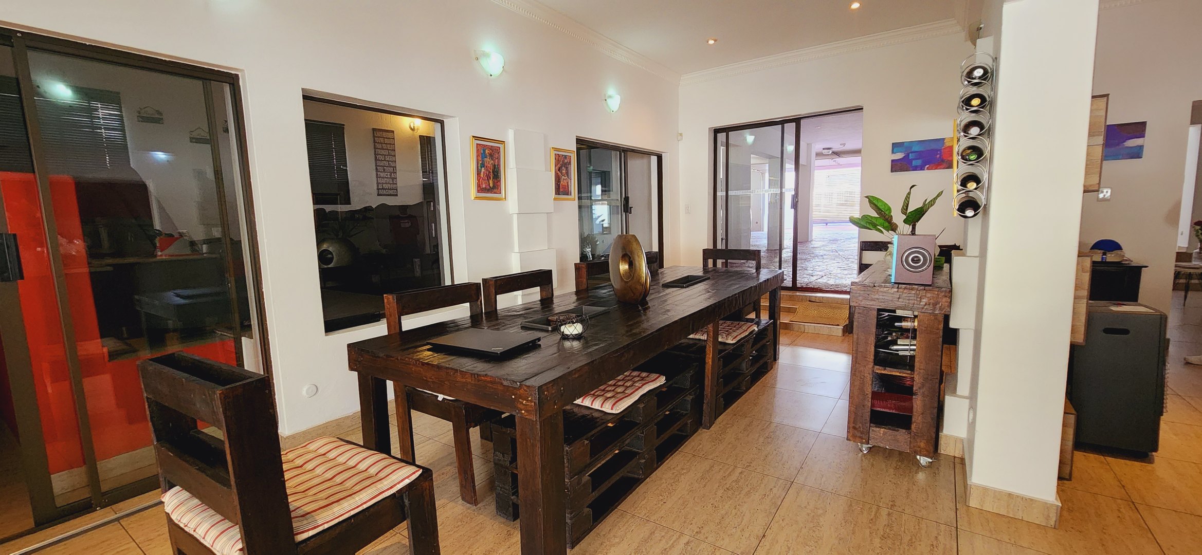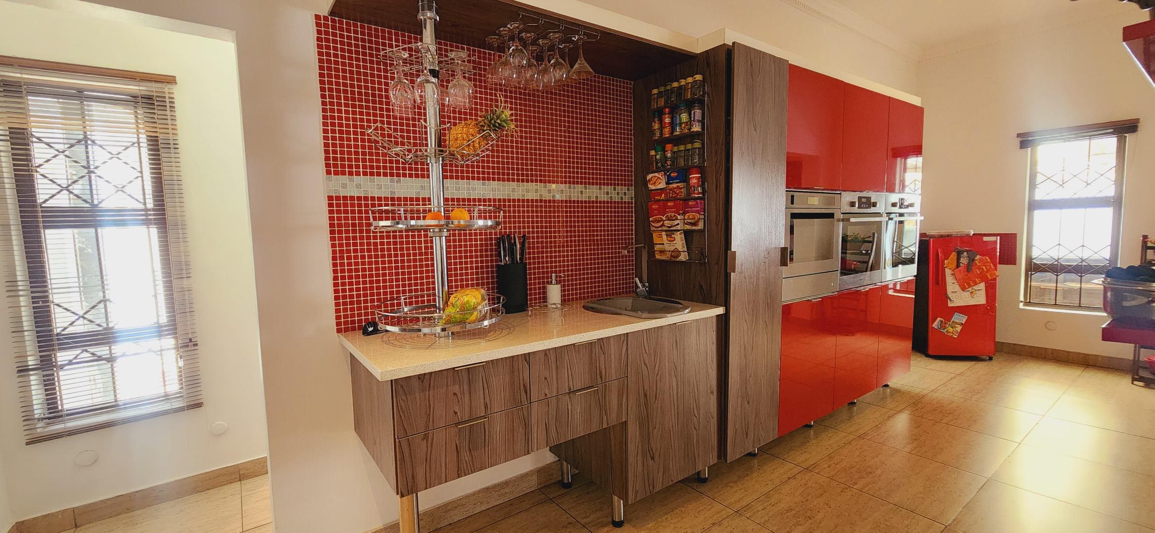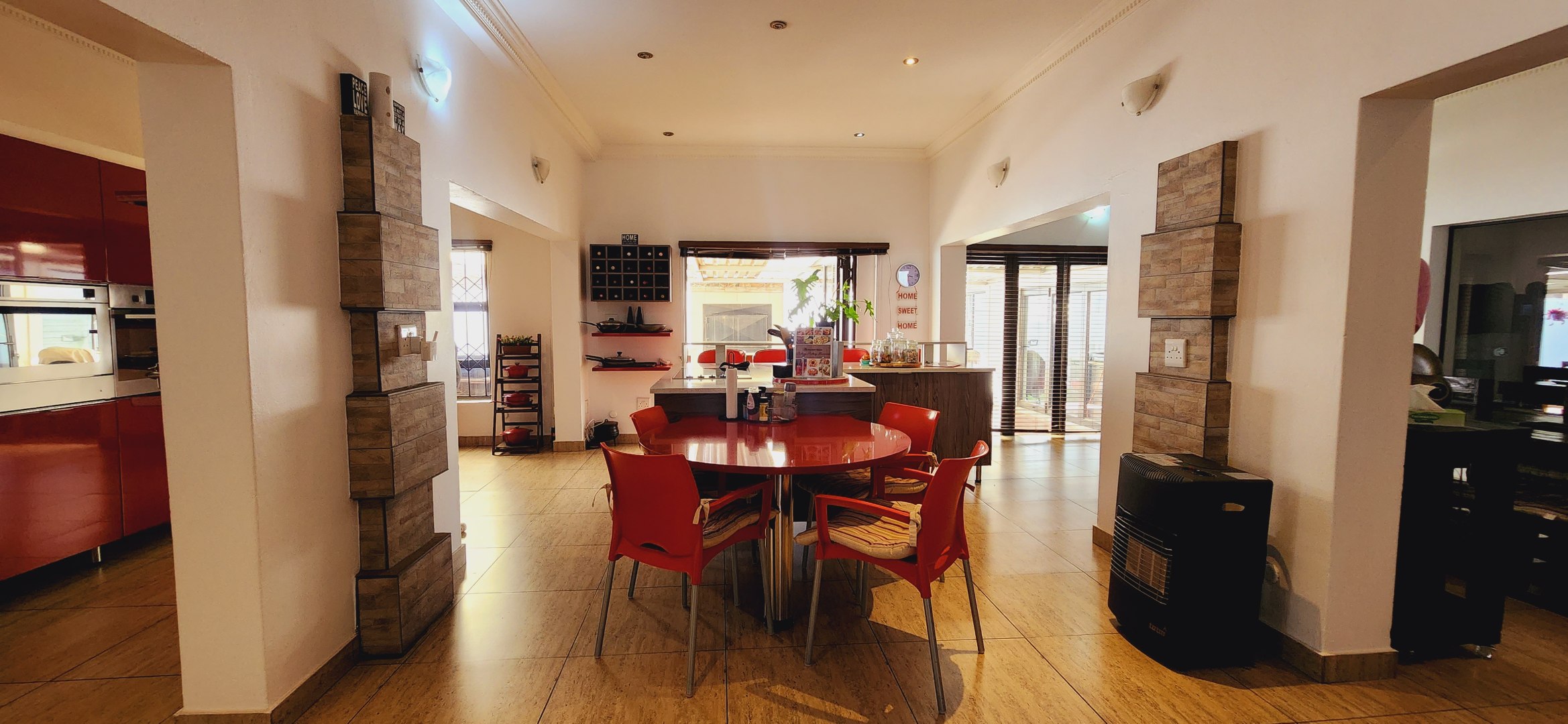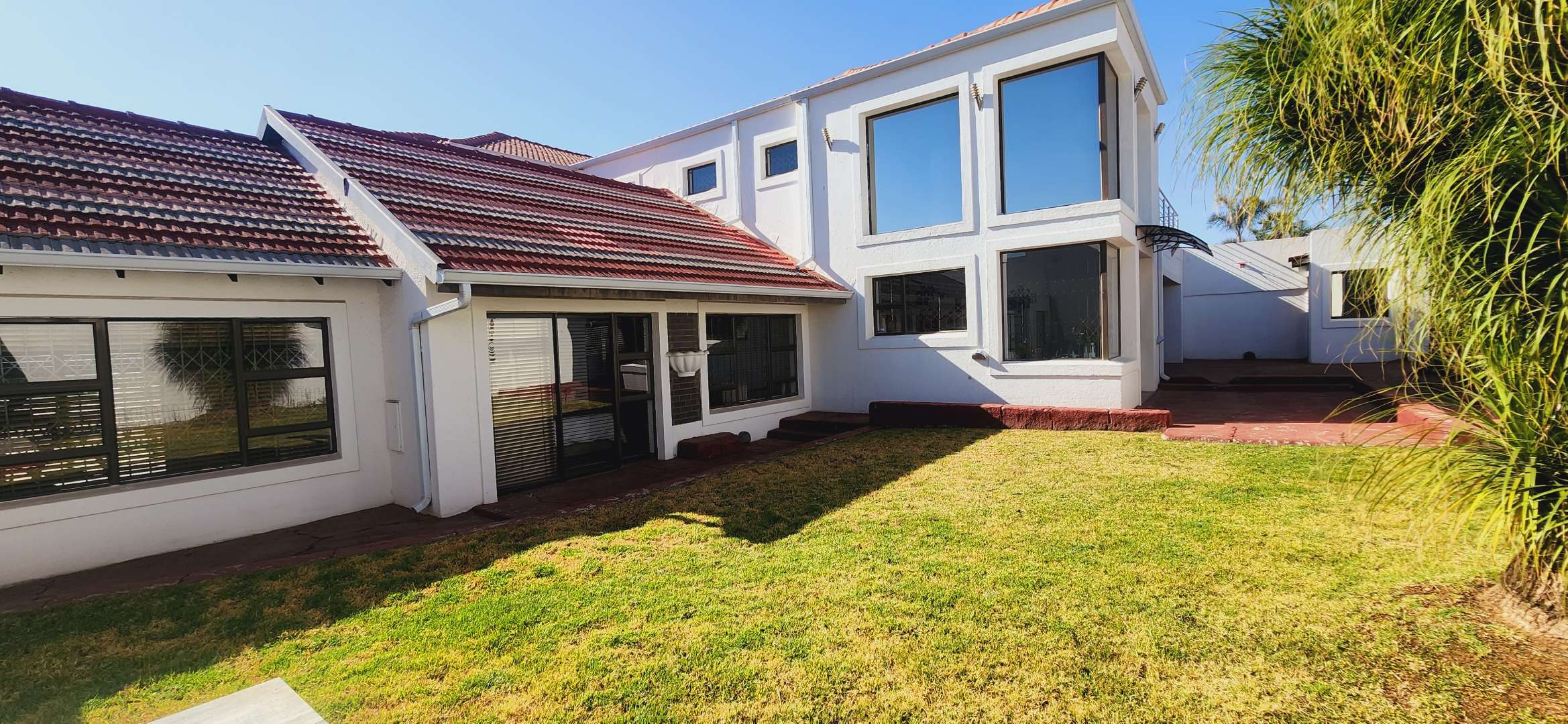 The outdoor area is just as impressive as the inside. The backyard features a sparkling swimming pool, a braai area, a bar area, and multiple entertainment and dining spaces – all surrounded by a well-kept garden. This setup is perfect for hosting gatherings or enjoying leisurely weekends with family and friends.