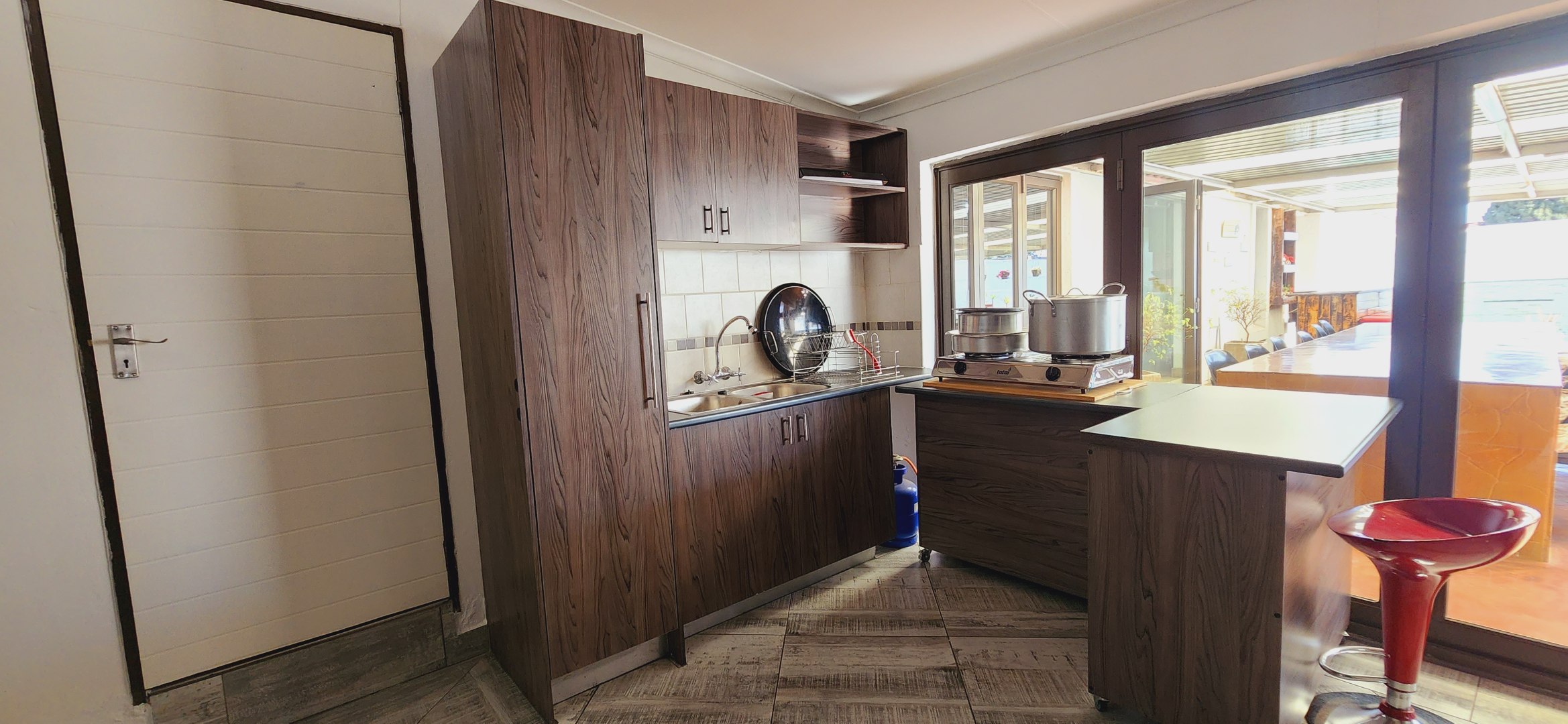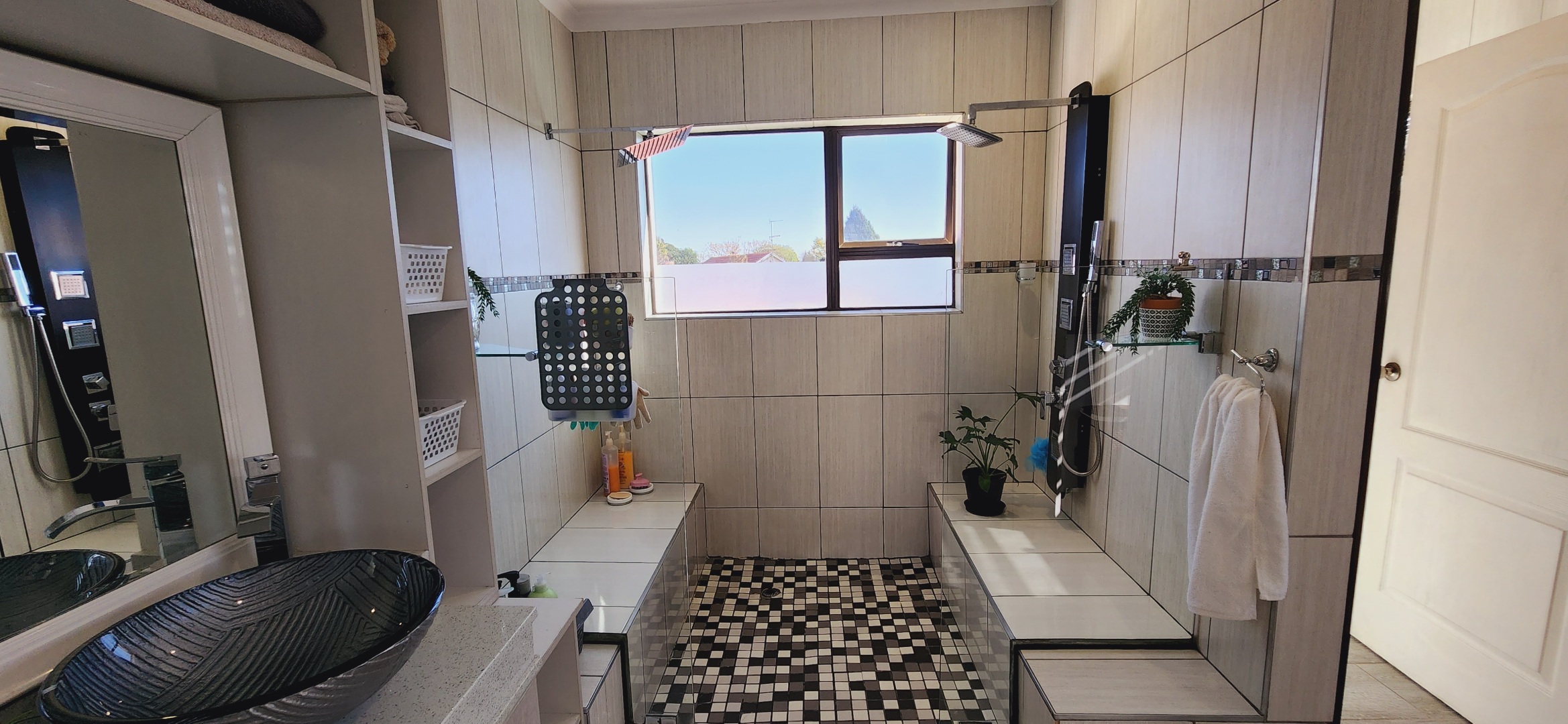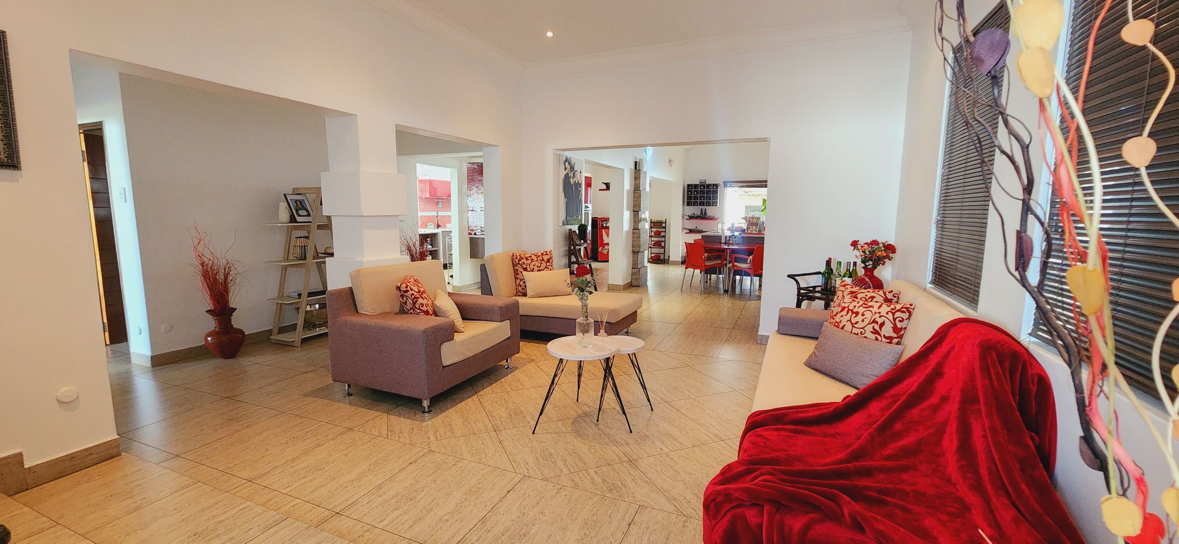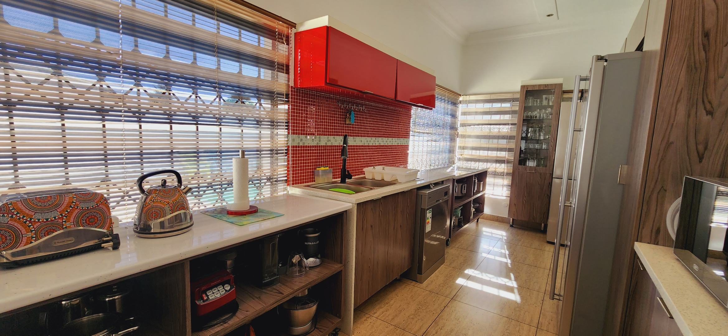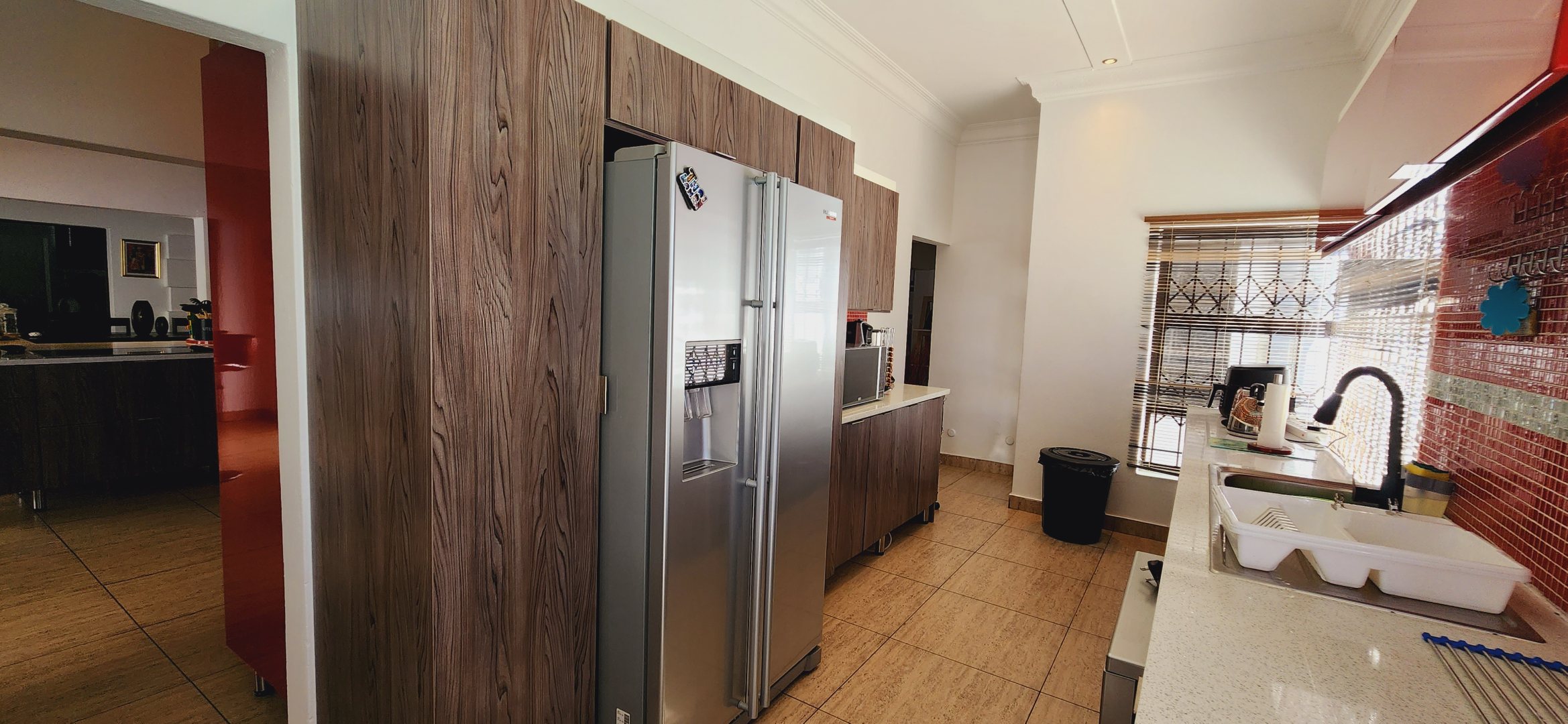 The outdoor area is just as impressive as the inside. The backyard features a sparkling swimming pool, a braai area, a bar area, and multiple entertainment and dining spaces – all surrounded by a well-kept garden. This setup is perfect for hosting gatherings or enjoying leisurely weekends with family and friends.