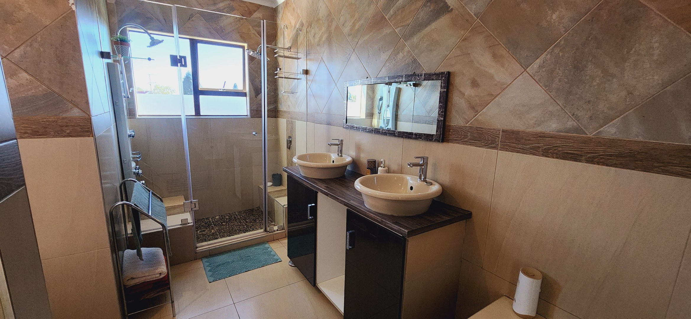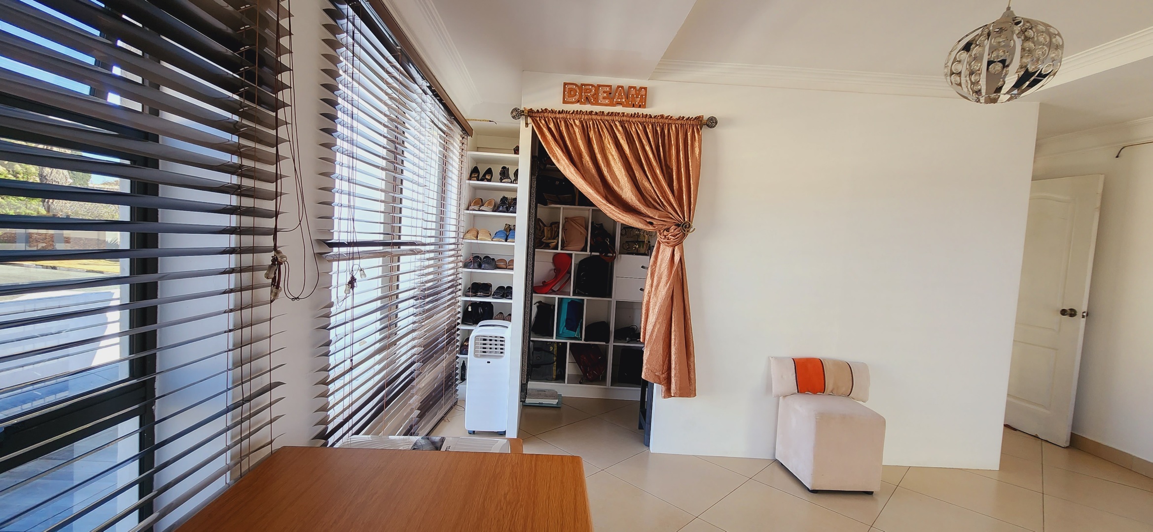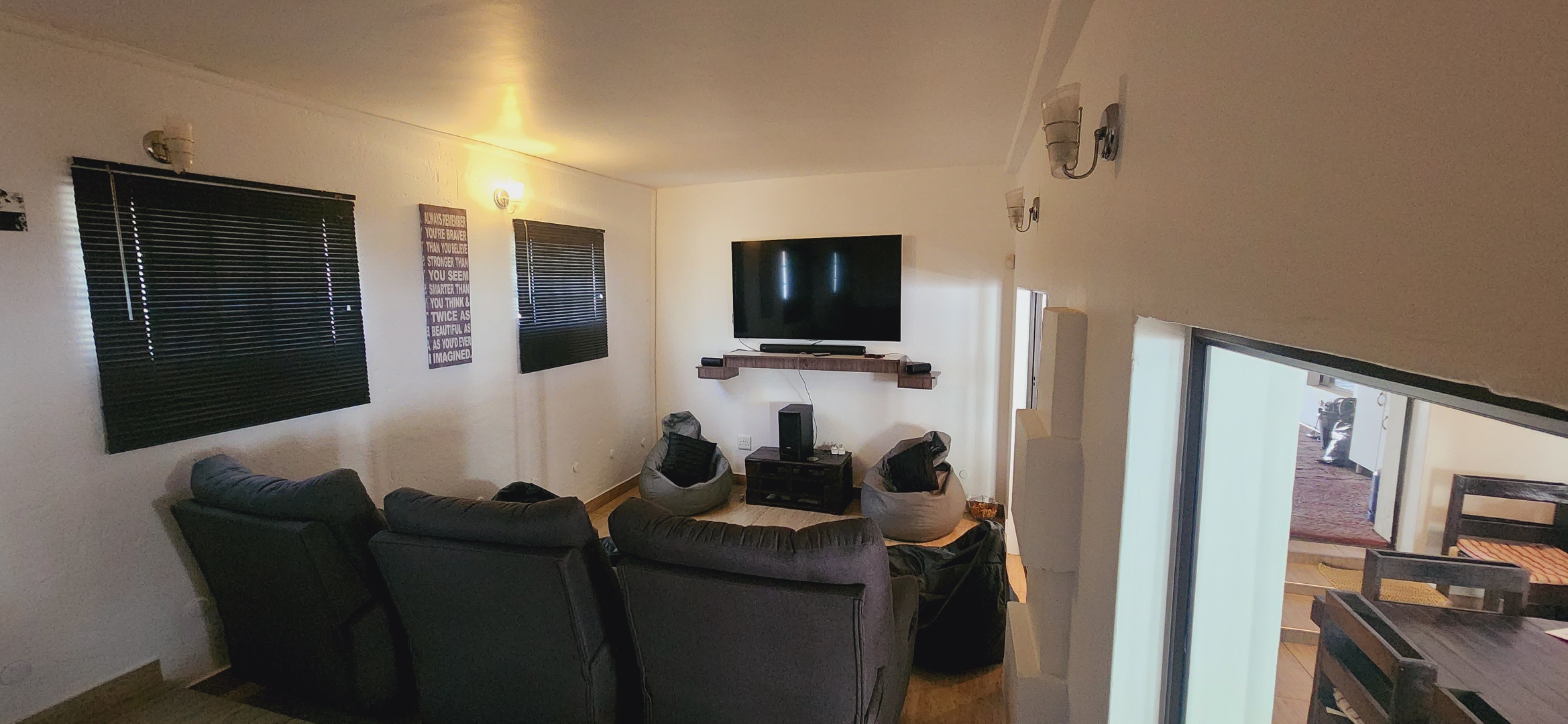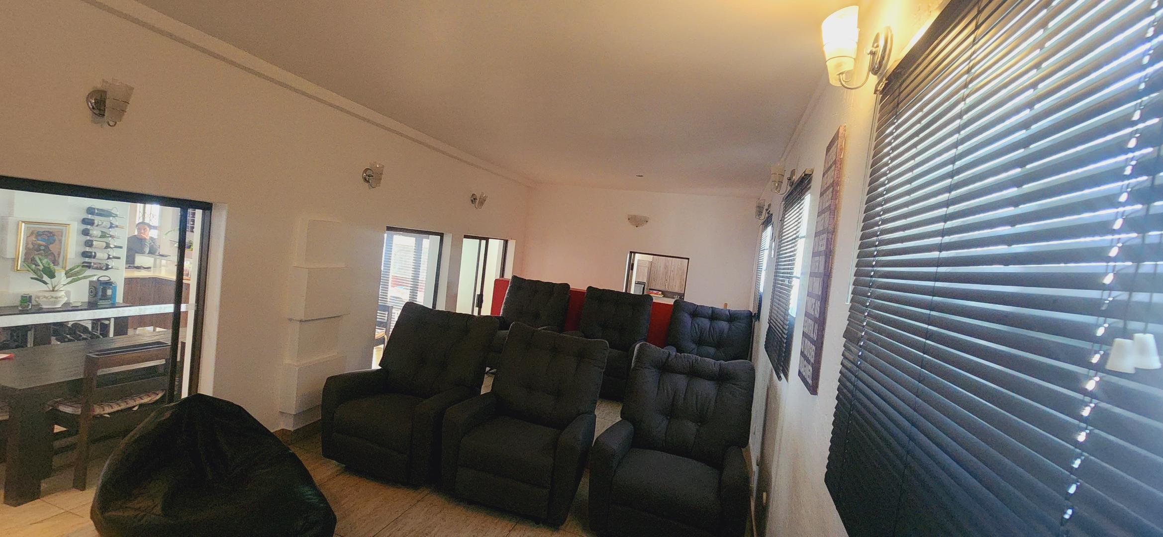 For movie enthusiasts, the home boasts a dedicated cinema room, offering the ideal spot for cozy family nights or private screenings. Just down the passage, there is a spacious bedroom with direct access to the back garden and pool area. This room shares a luxurious bathroom fitted with double basins, a double shower, and a toilet. In addition, the downstairs also features a comfortable en-suite bedroom, providing convenience and privacy for guests or extended family.