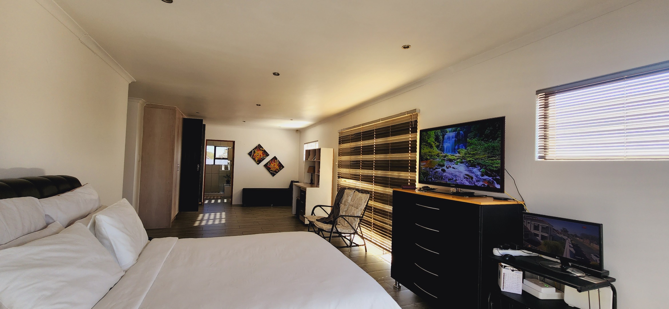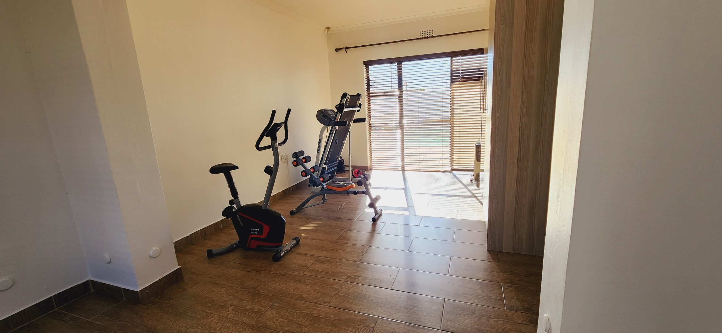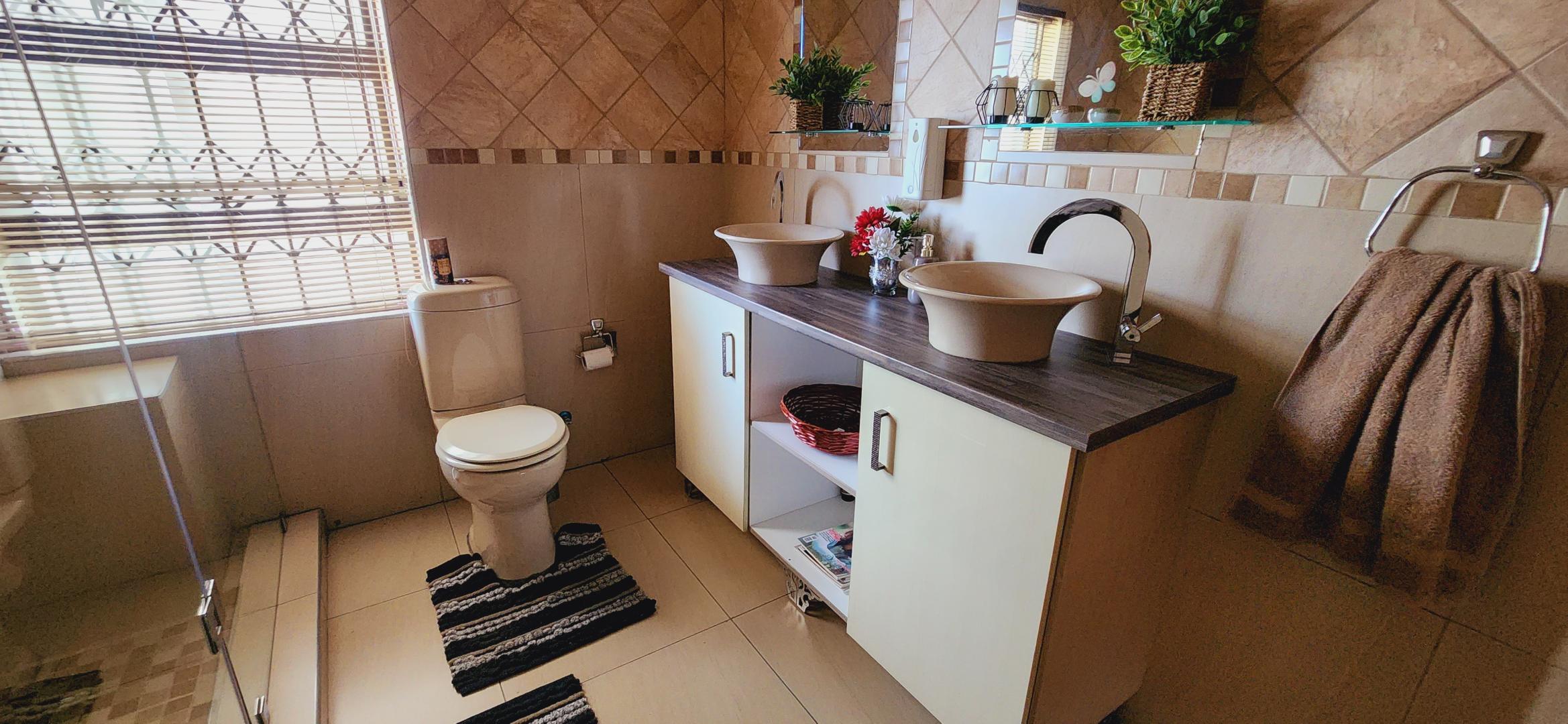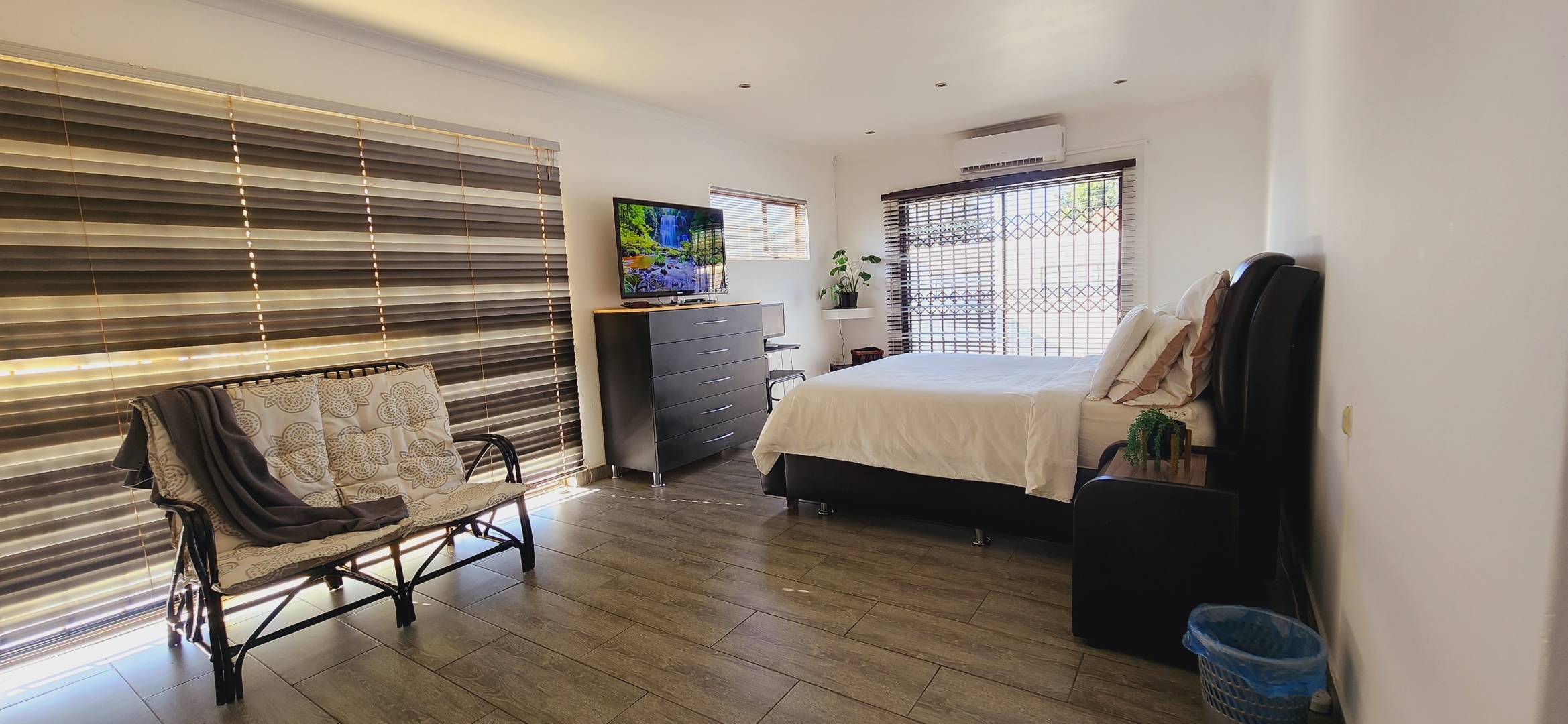 For movie enthusiasts, the home boasts a dedicated cinema room, offering the ideal spot for cozy family nights or private screenings. Just down the passage, there is a spacious bedroom with direct access to the back garden and pool area. This room shares a luxurious bathroom fitted with double basins, a double shower, and a toilet. In addition, the downstairs also features a comfortable en-suite bedroom, providing convenience and privacy for guests or extended family.